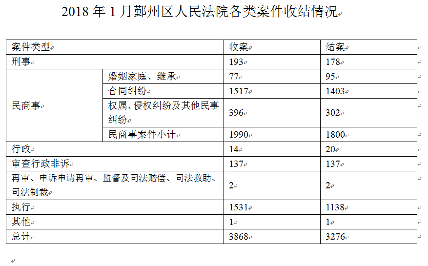 2018年1月鄞州区人民法院各类案件收结情况