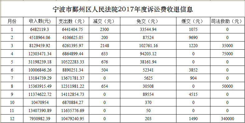 宁波市鄞州区人民法院2017年度诉讼费收退信息(全)